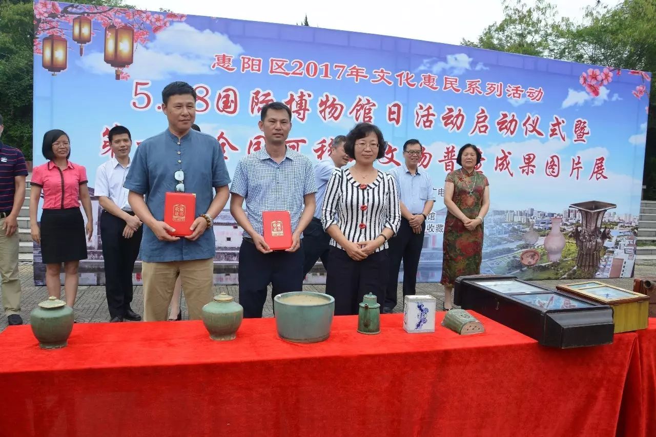 活动上,吴惠娇等15名热心市民向区博物馆捐赠了五十余件藏品。朱文转、黄雄等为这些热心市民颁发了收藏证书。随后,市民参观了我区“第一次全国可移动文物、不可移动文物普查”成果图片展。同时,广东省文物鉴定站专家许建林、赵敏、吴生道和惠州鹅城鉴宝专家李汉荣在现场为市民免费鉴宝。