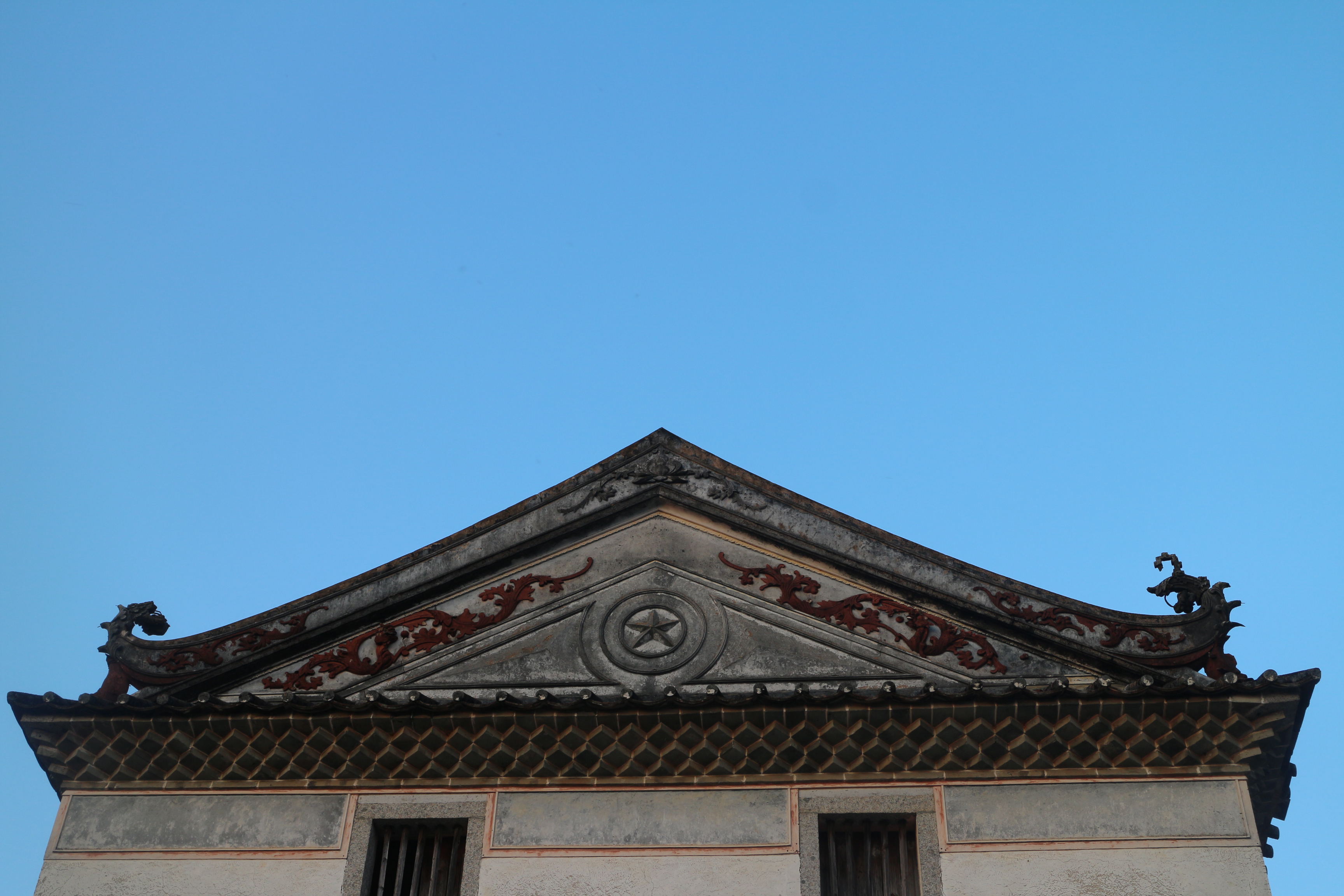 由叶敏予建造的角楼,现在还保留了一个。那金字形屋顶的角楼,是整栋楼的一大亮点。屋顶上翘起的鳌鱼尾巴,显示主人事业顺利如意,独占鳌头。那个五角星更是显得别致,表达出将星之意。在西洋风格的弧形窗户上,雕刻有象征长寿的仙桃,以及祝愿子孙昌盛、兴旺发达的瓜迭。从左侧的门进入,还可以看到石砌的“喜”字花墙,犹如一扇屏风,达到了很好的采光效果。