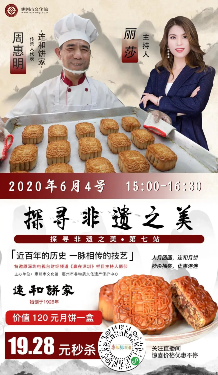3、打开微信公众号“惠州市文化馆”首页下方菜单栏“探寻非遗”,点击即可获得直播海报,识别海报小程序码后进入直播间。