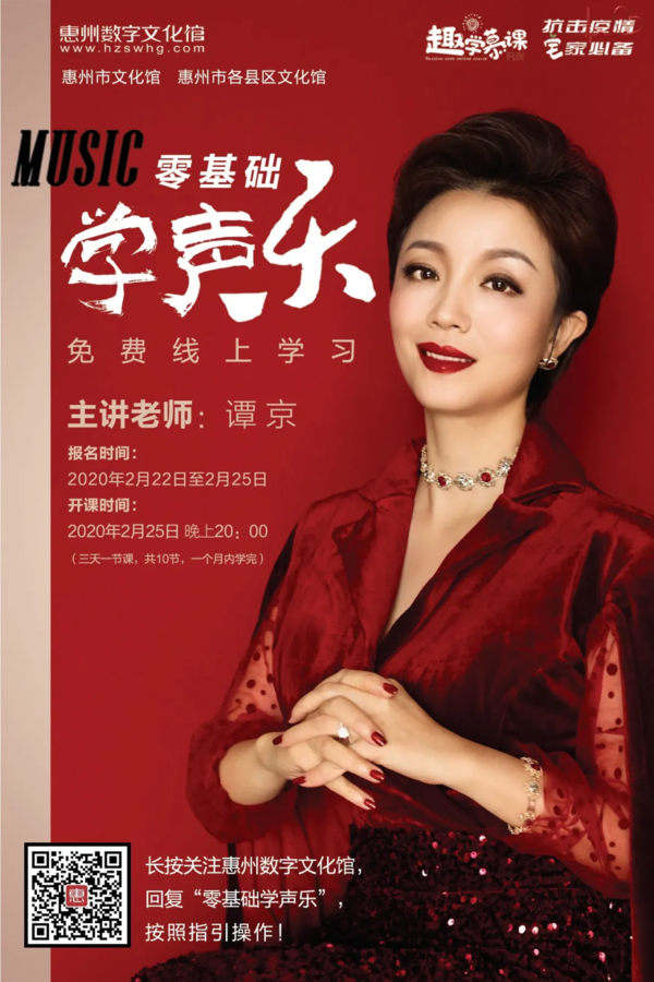 2、报名方法:请扫描下方海报,关注惠州数字文化馆后,回复“声乐”,按照指引进入课程网址,点击“加入学习”