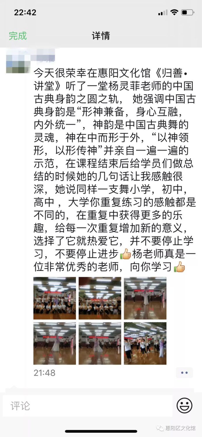 7月23日下午15点,由惠阳区文化馆总馆主办的“归善讲堂”系列活动《中国古典舞身韵-圆之轨》开讲啦!本次讲堂邀请到广东省舞蹈家协会会员、惠阳区舞蹈家协会主席杨灵菲老师主讲。