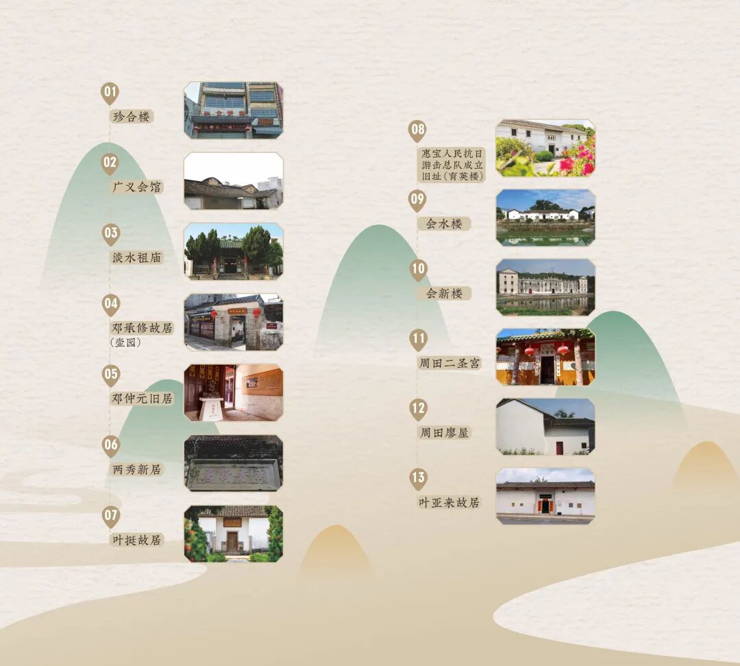 不满足于千篇一律的风景 厌倦了走马观花式的旅游 想要打卡网红地标 没问题,统统满足你! 本期小南精心推荐一条 有吃有玩有内涵的旅游路线 惠州将军故里历史文化游径 收藏,开冲! 惠州将军故里历史文化游径 ●官方认证丨入选广东省历史文化游径 ●人文厚重丨感受红色、客家、华侨文化印记 ●多元场景丨涵盖丰富的文保单位和优质景区 ● 精品食宿丨沿线可享受网红民宿和特色美食 让我们寻着时光的脚步 以历史为骨,文化为翼 重走将军故里吧! One 遇见· 民国故事 惠阳旅游 珍合楼 这座始建于民国时期的茶楼,是淡水最早的茶楼。古朴的青砖外墙,雅致的阴阳瓦顶,一笔一画都是时光的手笔。 昔日的繁华在历史的洪流中渐渐隐退,留下了这座不朽的老楼散发着属于历史的独特气味,如今不少年轻人还会专程来到珍合楼,只为好好感受下当年的味道。 地址:惠州市惠阳区淡水街道前进社区大鱼街 惠阳旅游 广义会馆 想了解民国时期的惠阳,一定不能错过广义会馆,它是有名的古“淡水八景”之一。 据说广义会馆由以前的广府商人所建,建成以后生意越做越兴隆,现在依稀可以领略昔日淡水墟的繁华。如果摸一摸这些印迹,是不是可以沾到一点福气保佑生意兴隆呢? 地址:惠州市惠阳区淡水街道前进社区广义街 惠阳旅游 淡水祖庙 “千山万水,不如淡水”。很多人初来淡水,立刻就会被它迷人的旧日风情所俘获。淡水祖庙就是这样一个宝藏的存在,说它是一代淡水人的记忆真是一点也不夸张。 淡水祖庙历史悠久,是难得的底蕴深厚的文化遗产。逢年过节更是香火旺盛,来烧香祈福的人络绎不绝,它在淡水人心里的地位无人可取代。 地址:惠州市惠阳区淡水街道祖庙前街47号 Two 邂逅 · 名人故居 惠阳旅游 邓承修故居(壶园) 来到邓承修故居(壶园),不仅能了解到传奇“铁笔御史”的故事,还能在距北京千里之外的惠阳欣赏到北京四合院的建筑风格。相传壶园是慈禧太后派专人设计的建筑图纸哦,所以建筑风格非常特别呢~ 地址:惠州市惠阳区淡水街道红星社区上拔子园街14号 惠阳旅游 邓仲元旧居 建于清朝末年的邓仲元旧居,是清末民初东江府第式民居的代表性建筑之一哦,悄悄说一句,对游客免费开放~走过路过千万不要错过! 地址:惠州市惠阳区淡水老城猪行东街51号 惠阳旅游 两秀新居 强烈安利两秀新居,一定要去打卡!整体虽然看起来平平无奇,却给人一种很特别的古早味。随手一拍,就是氛围感十足的故事大片。 更别说两秀新居的两兄弟,一个九岁擢童科,一个十二岁擢登三礼科,简直是学霸中的锦鲤,必须前去膜拜! 地址:惠州市惠阳区淡水街道红星社区上拔子园路 Three 千秋人文古迹 · 周田村 走进周田村,既有深厚的人文环境和历史古迹,亦有优美的自然风光,是游历探古的好去处。 惠阳旅游 叶挺故居 周田村景点的C位担当,当仁不让是叶挺故居。这里是叶挺祖屋,清末时期叶挺祖父叶沛林所建,两进院落式布局清丽雅致,现故居门前所挂“叶挺将军故居”牌匾为江泽民同志亲笔书写。走在叶挺将军从小生活的地方,让人忍不住感慨先人的辉煌功绩。 惠阳旅游 惠宝人民抗日游击总队成立旧址 紧挨着叶挺将军故居的是其胞弟叶辅平的故居——惠宝人民抗日游击总队成立旧址,也非常值得一去。这是一座独立式的客家民居,家长们可以带着小朋友一边漫步在蓝天白云下,一边感受先辈们的革命精神,也是一个不错的选择。 惠阳旅游 千年客家文化,百年红色经典。提到客家文化,就不得不提著名的客家围屋会水楼。会水楼是这一带叶氏家族的老祖屋,建筑风格为三进两横旧式客家民居,历经百年风雨仍然保持原貌。 惠阳旅游 会新楼 你以为惠阳客家围屋只有这一种风格吗?错!惠阳的建筑风格十分多元,包容万千,最典型的就是糅合了中西建筑风格的会新楼。 整座围屋外墙均有西式的灰塑,中间大门为中轴祠堂门,听摄影师们说来这里拍照出片率很高哦~ 惠阳旅游 周田二圣宫 每年农历十月十五,周田村都会举行一次祈福活动,相隔十年举行一次大型的醮会,其规模之大,听闻远渡海外的侨胞也会赶回来参加。 惠阳旅游 周田廖屋 周田村还有一处值得一逛的地方,是长征女杰、原广东省政协副主席廖似光同志的故居。周田廖屋始建于清朝初年,占地面积约1120平方米,为三进堂屋、三横的客家围屋,适合对地方历史文化感兴趣的朋友们。 惠阳旅游 叶亚来故居 最后一站是去叶亚来故居打卡,这里是“吉隆坡王”叶亚来出生、成长的地方。 现在叶亚来文化展示馆已经对外免费开放啦,对叶亚来的逆袭人生感兴趣的朋友们,不要错过哦。 美食 · 吃喝攻略 特色 · 民宿打卡 趁着秋高气爽 赶快约上小伙伴 一起打卡惠阳将军故里历史文化游径吧!